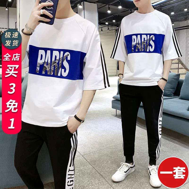 Áo thun nam tay ngắn phiên bản hàn quốc xu hướng nam thể thao rộng rãi giản dị một bộ quần áo hàng hiệu mùa hè in triều mùa hè - Bộ đồ