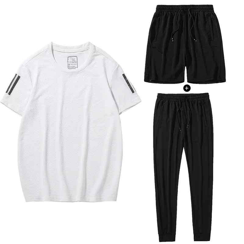 Bộ đồ thể thao cỡ lớn mới mùa hè của nam giới quần đùi áo thun chạy bộ thoáng khí khô nhanh chóng cộng với phân bón để tăng bộ đồ ba mảnh - Bộ đồ
