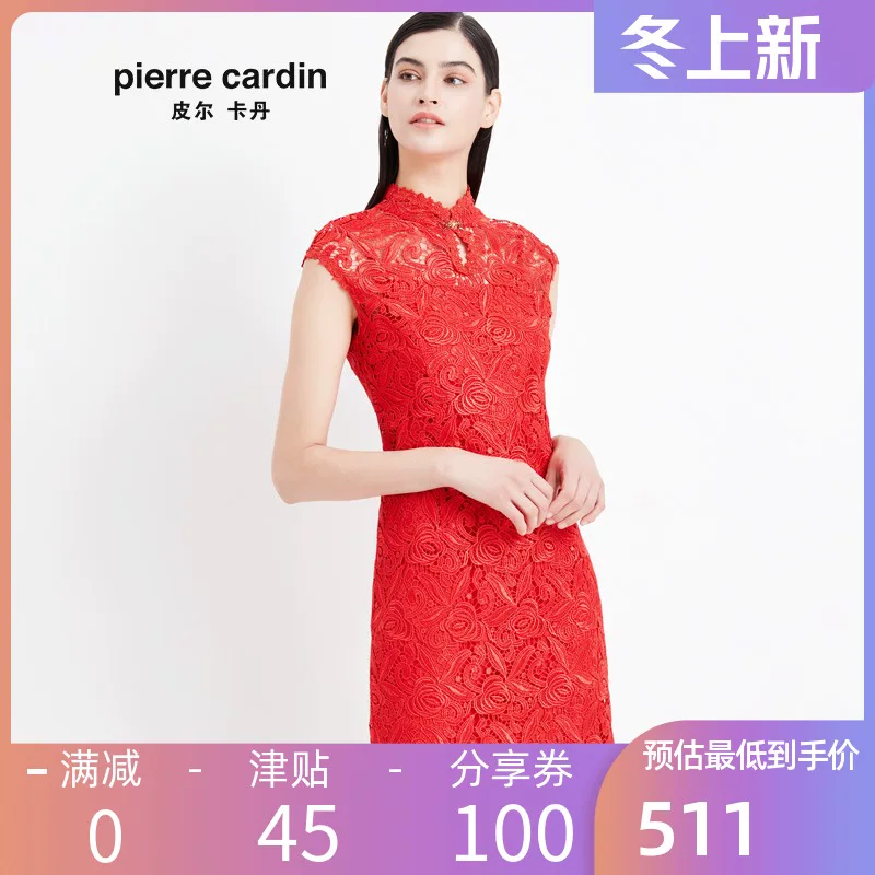 Pierre Cardin phụ nữ mặc năm 2020 mùa hè mới màu đỏ không tay váy thắt lưng thời trang nửa cổ cao váy phụ nữ dài trung - Váy dài