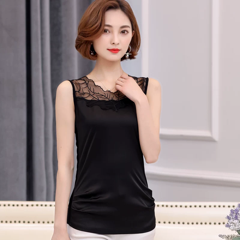 Áo sơ mi nữ viền ren cổ chữ V, bên trong bằng lụa satin, thời trang và gợi cảm, bên ngoài mặc trong màu mỏng trên cùng - Áo ba lỗ