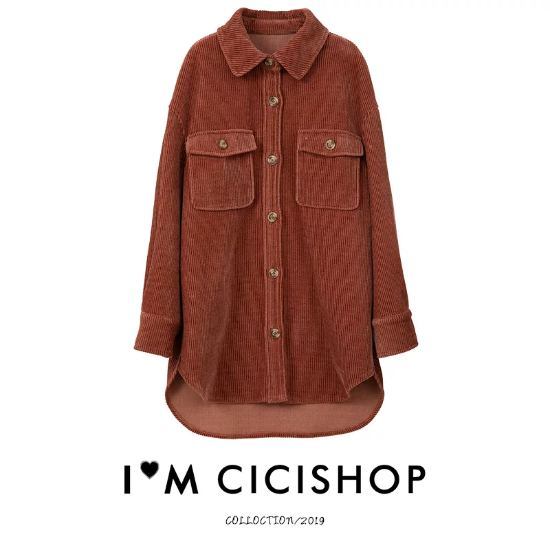 Áo khoác len nữ dài trung bình CICISHOP2019 mới áo khoác nhung kẻ ngang thường áo khoác ngoài - Áo len lót đôi