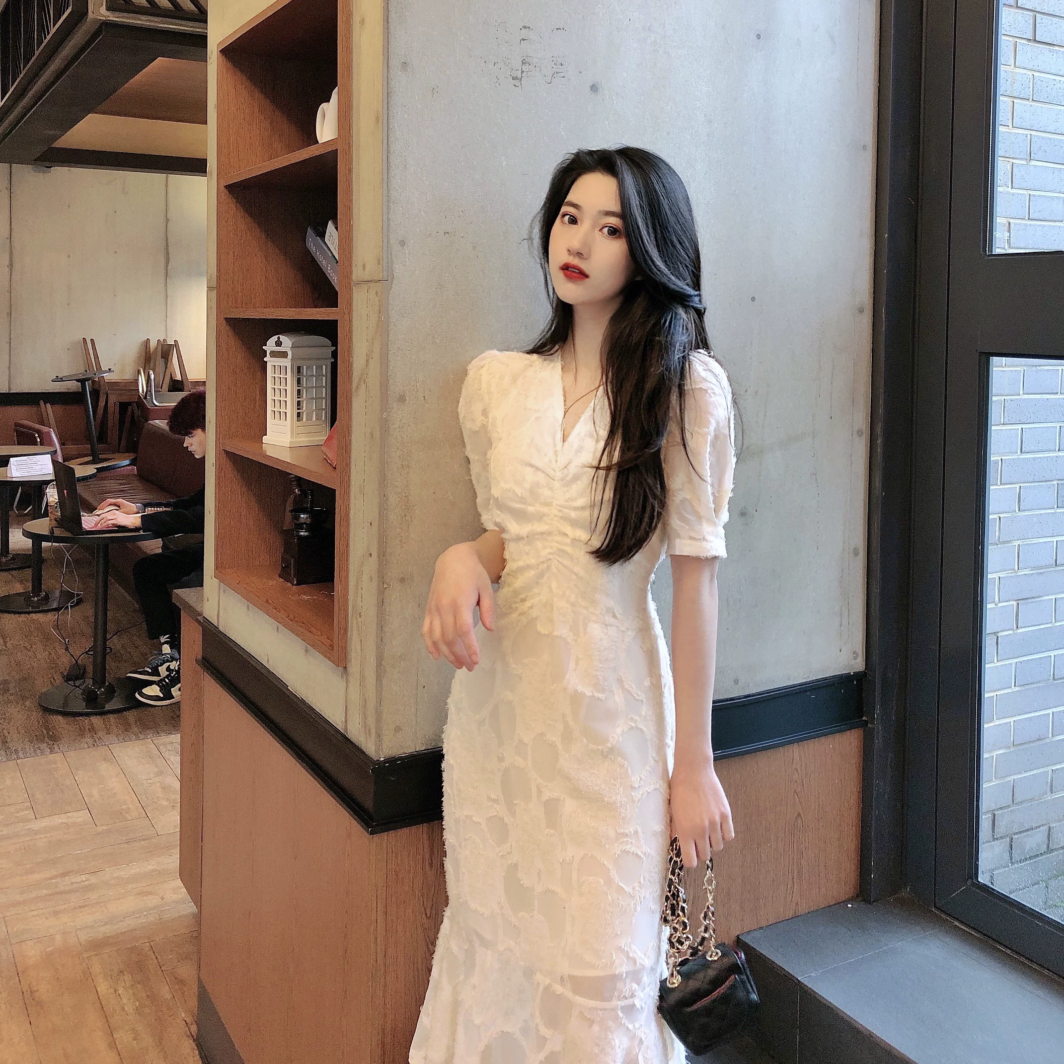 Váy đuôi cá Váy Pháp cổ chữ V váy nữ mùa hè 2020 mới thon gọn váy dài - Sản phẩm HOT