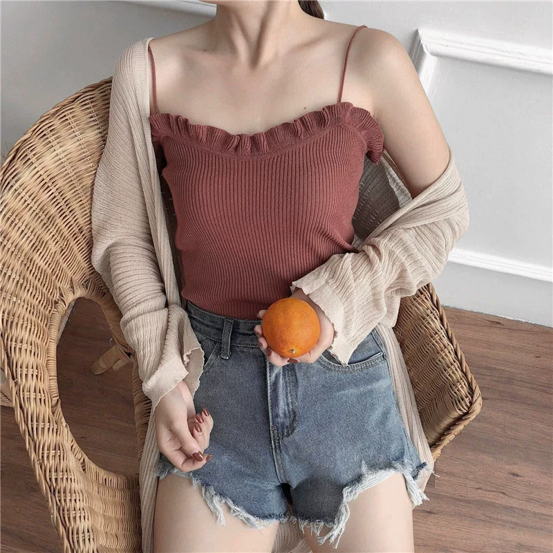 Mùa hè không tay Vest cô gái Hàn Quốc Cổ áo búp bê Sling mỏng cổ chữ V ngắn dệt kim Cơ sở hàng đầu - Áo ba lỗ