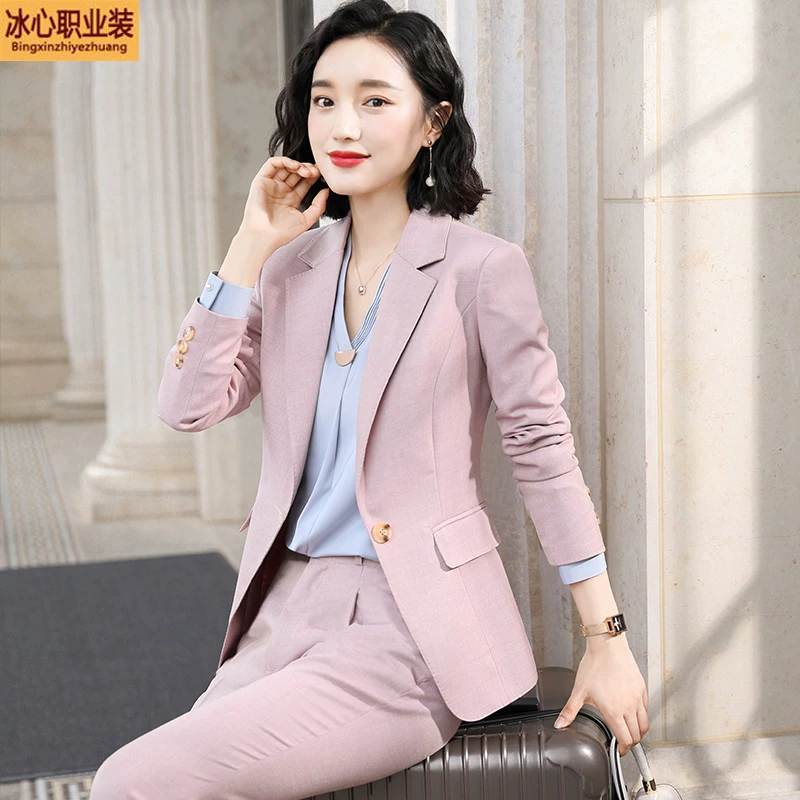 Bộ đồ màu hồng nữ chuyên nghiệp mặc thời trang tính khí phụ nữ sự kiện mặc quần áo chủ nhà làm việc phù hợp với áo khoác nhỏ phụ nữ - Bộ đồ