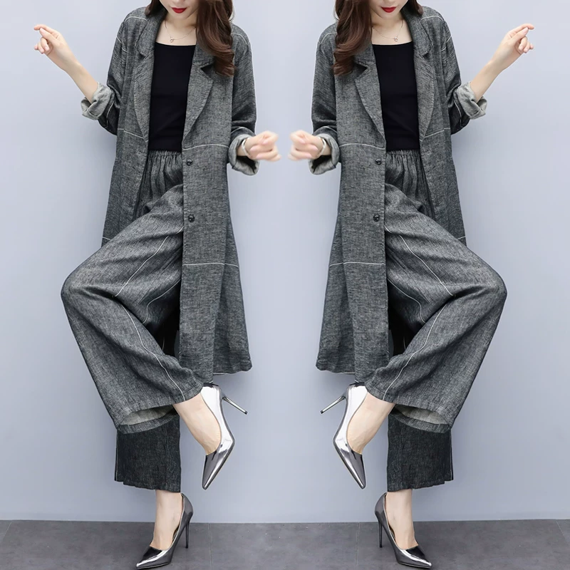 Bộ quần áo vải lanh và cotton cỡ lớn thông thường nữ 2021 Thời trang Hàn Quốc nhỏ kiểu phương Tây linen quần ống rộng hai mảnh hakama - Bộ đồ