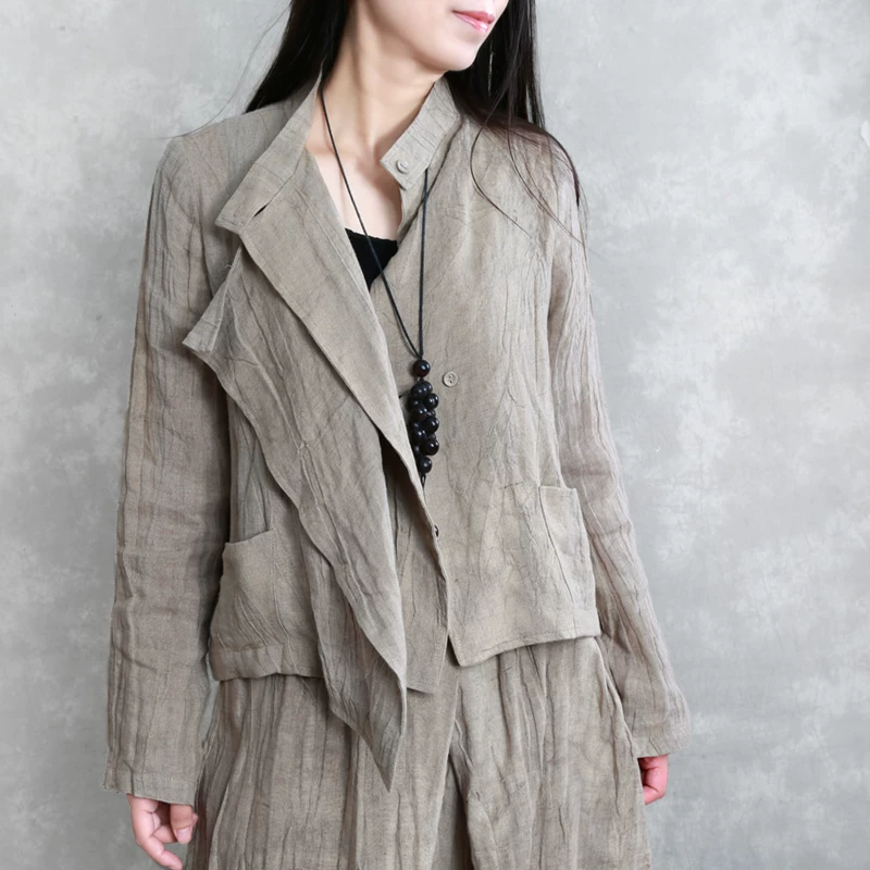 【Tây Phong】 Nguyên bản của phụ nữ mùa xuân và mùa thu vải lanh tinh khiết không đều cổ áo khoác cá tính ngách Phù hợp với khí chất Zen - Bộ đồ