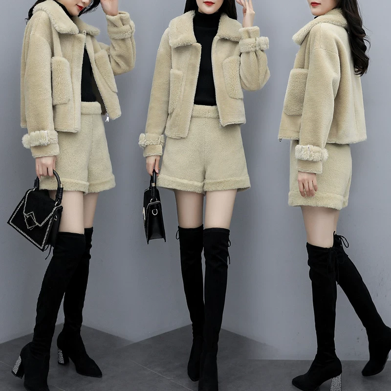 Phụ nữ mới mùa đông năm 2021 áo khoác ngắn sang trọng quần đùi áo khoác ngắn hai mảnh lông thú tất cả trong một bộ đồ thời trang của phụ nữ dày - Bộ đồ
