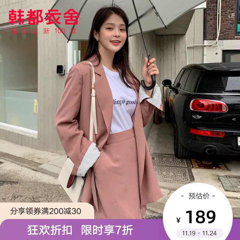 Handu Yishe 2021 quần áo phụ nữ mùa thu Hàn Quốc lưới màu đỏ nhỏ phù hợp với áo khoác ngắn váy ngắn hai mảnh màu hồng phù hợp với thời trang - Bộ đồ