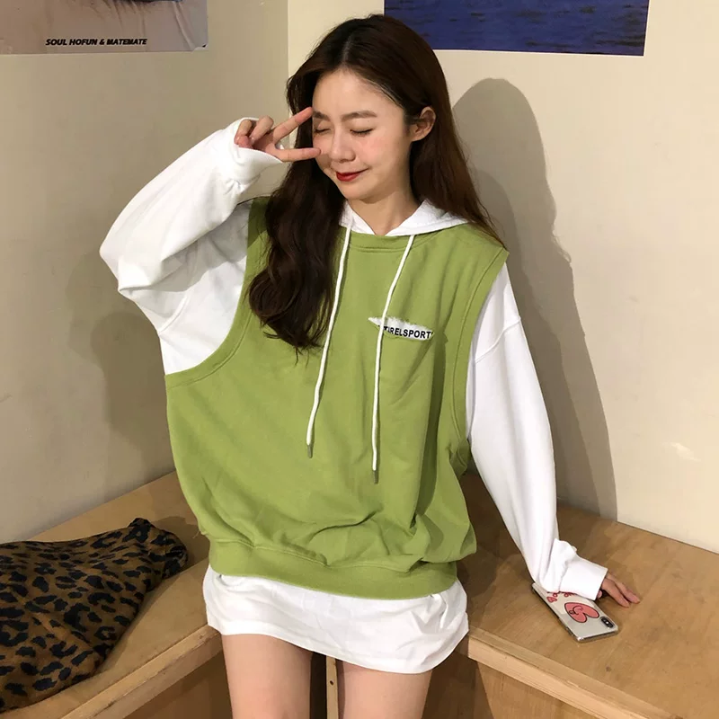 Áo hoodie nữ mỏng phần 2020 phiên bản mới của Hàn Quốc cắm màu giả hai mảnh bf áo hoodie nữ cỡ lớn áo khoác nữ - Áo len