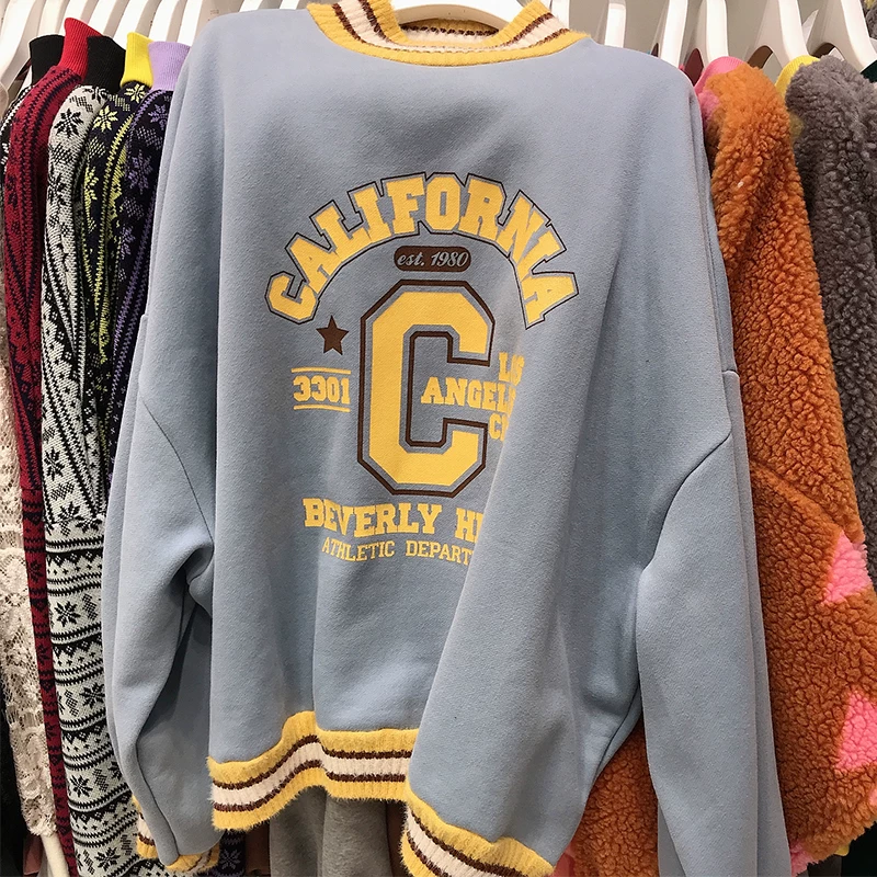 . Mùa thu và mùa đông cộng với áo len dày nhung nữ phiên bản Hàn Quốc của áo khoác rộng có mũ trùm đầu phong cách Harajuku thêu áo dài tay - Áo len
