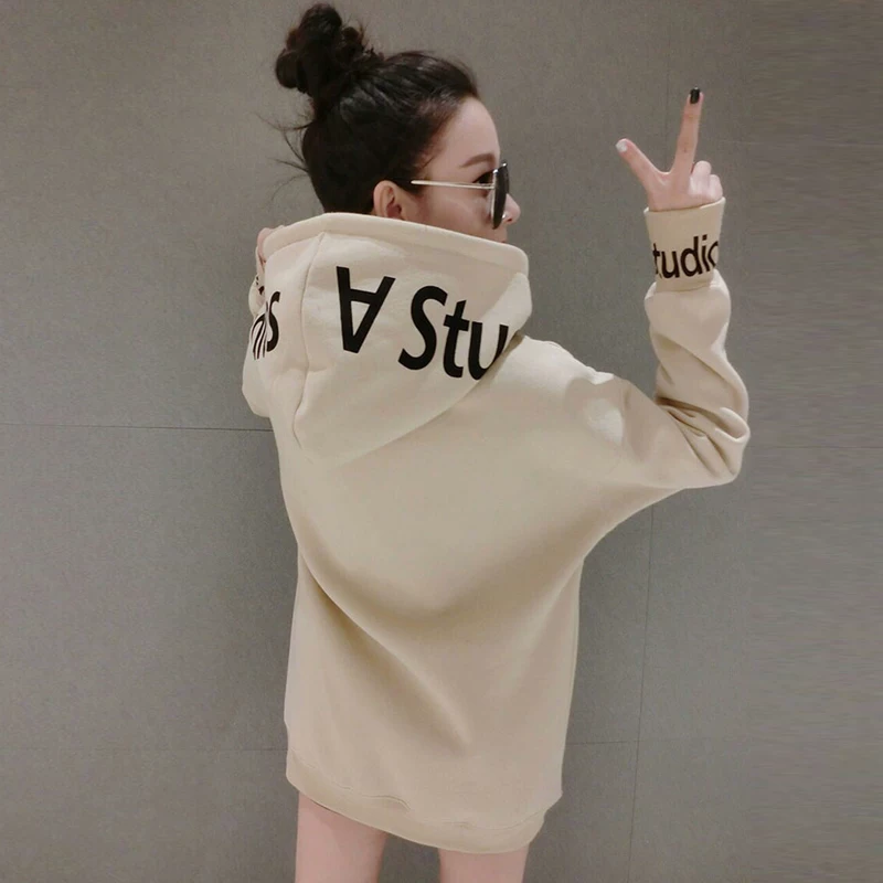 300 catties oversized có mũ trùm đầu in áo len nữ mùa thu và mùa đông lỏng Phiên bản Hàn Quốc của áo khoác dạ dày và nhung trung 200 - Áo len