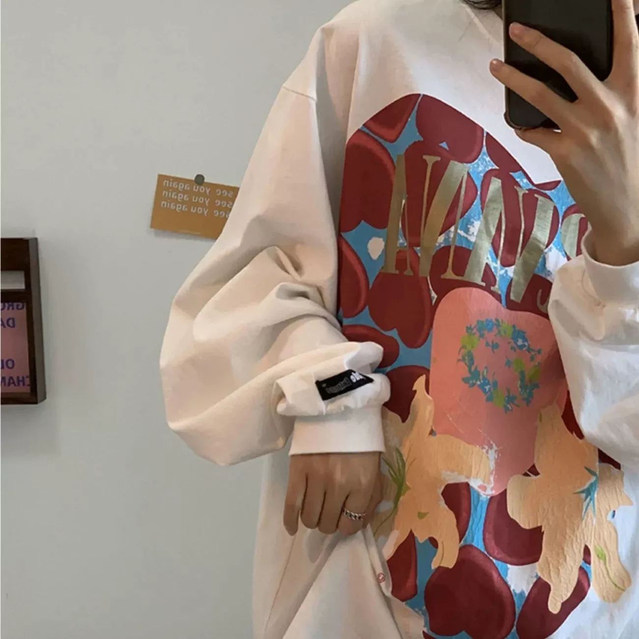 Năm 2021 mùa xuân mới in chữ hàn quốc cỡ lớn phụ nữ cổ tròn rộng rãi giữa áo len mỏng dài giữa áo khoác nữ - Áo len