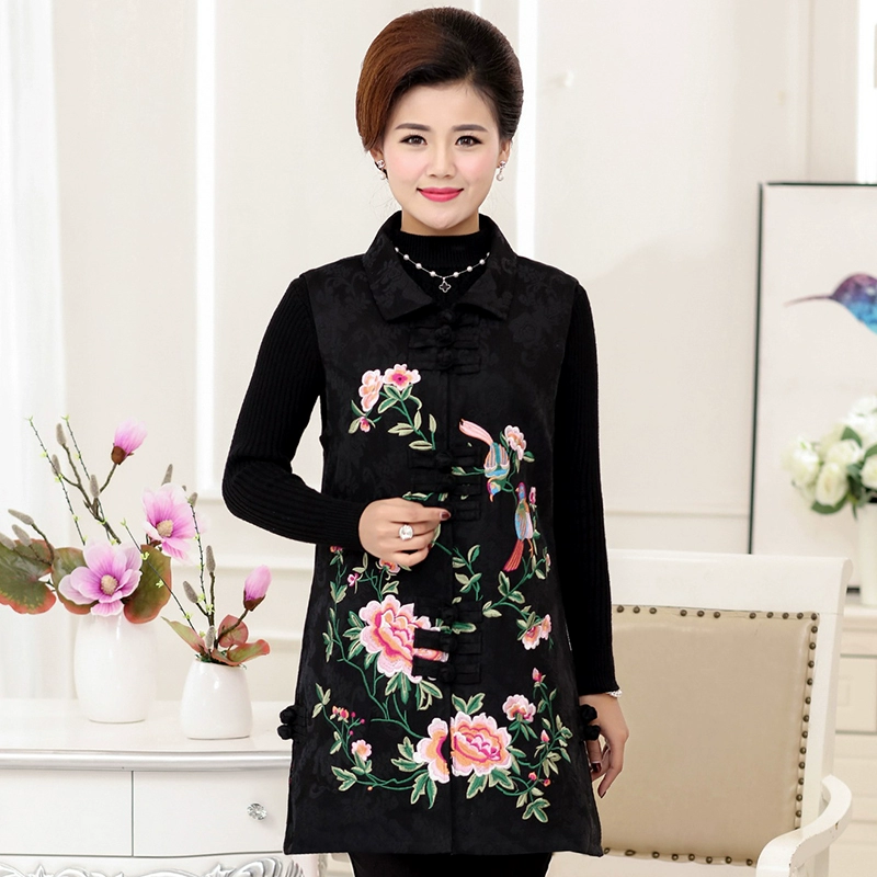 Phong cách dân tộc Tang phù hợp với áo vest của phụ nữ trung niên và cao tuổi mùa xuân và mùa thu vải cotton và vải lanh thêu ghi lê áo vest của phụ nữ trung niên áo khoác của mẹ - Áo vest