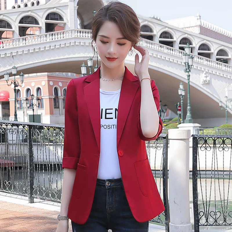 Q Hàn Quốc nhập khẩu mua mùa hè 2020 phụ nữ mới đi làm V-cổ một nút mỏng mỏng phù hợp với áo khoác hoang dã 5 - Business Suit