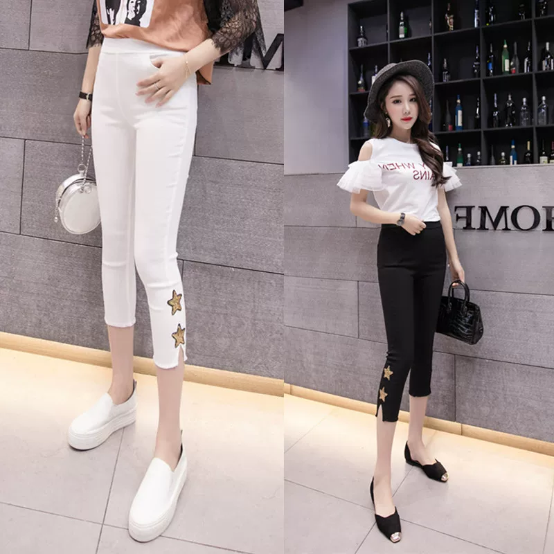 Mùa hè 2019 phiên bản Hàn Quốc của quần lửng đen đinh tán quần legging nữ mặc quần mỏng phần quần lọt khe - Khởi động cắt