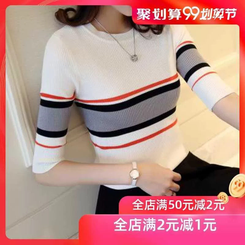 Yinger Psalm Women 2020 Mùa hè mới thoáng khí cổ tròn sọc dệt kim áo len áo phông đứng đầu phụ nữ - Áo / áo thun