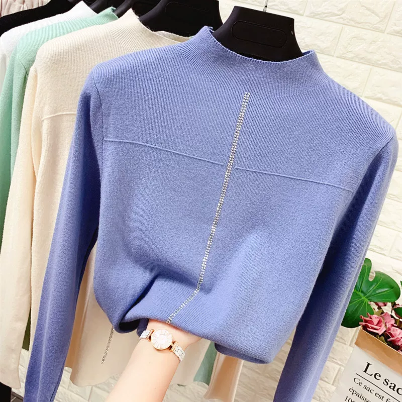 Áo len cổ cao bán dọc sọc dọc kim cương dài tay áo len nữ mùa thu mới slim-fit co giãn rắn màu kim cương nóng áo len đáy quần áo len - Áo len cổ chữ V