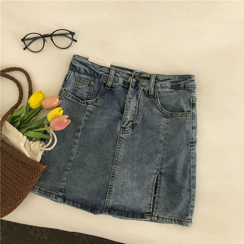 xin chào người mẫu cơ bản hoang dã Một chiếc túi đeo hông ngắn đoạn cao bùng nổ váy denim 2020 hè mới - Váy