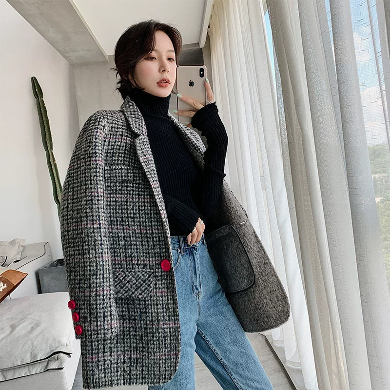 Áo len lông cừu nhỏ Tương Phong nữ ngắn 2019 mùa đông Hàn Quốc phiên bản lỏng của houndstooth len khâu áo khoác dày - Áo khoác ngắn