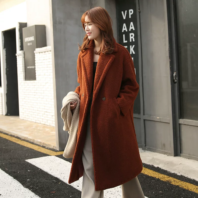 Xiaochen retro mờ màu đỏ giữa hai chiều dài áo khoác lông cừu phụ nữ trên đầu gối áo len lỏng lẻo - Áo khoác dài