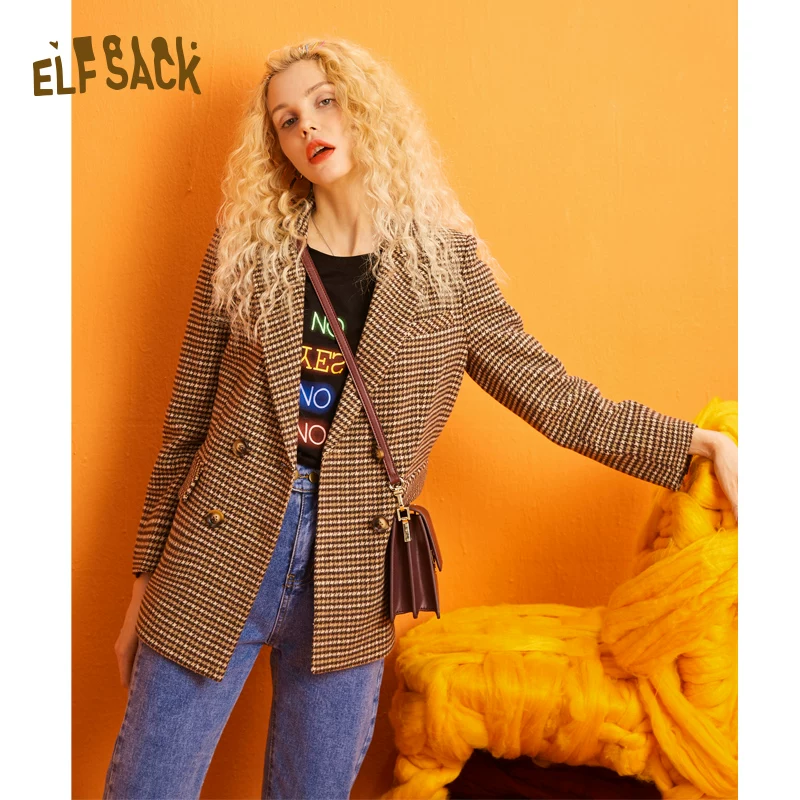 SX Shanxi hồ sơ houndstooth tweed áo khoác len của phụ nữ giữa chiều dài áo len lỏng áo len của phụ nữ - Accentuated eo áo