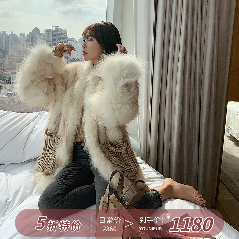 Áo lông cáo màu đỏ lông cáo nữ lông bụng dệt kim túi lớn vừa dài phần 2019 mùa đông mới lông một - Faux Fur