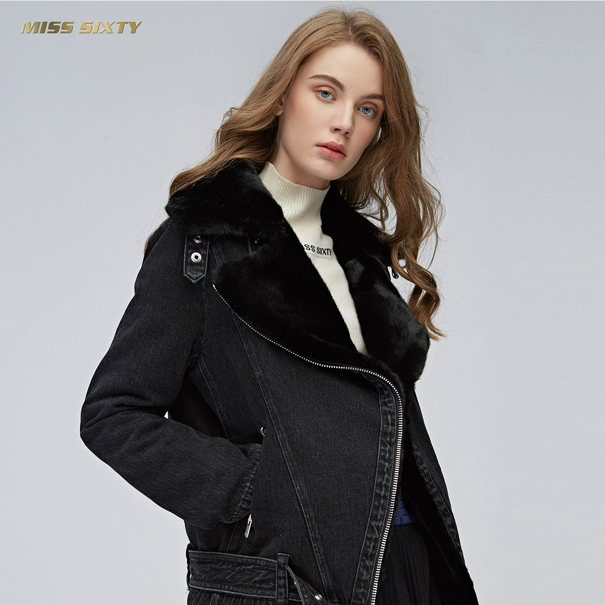 Miss Sixty mùa đông ve áo dày lông màu xanh lá cây lót denim áo khoác phụ nữ - Faux Fur