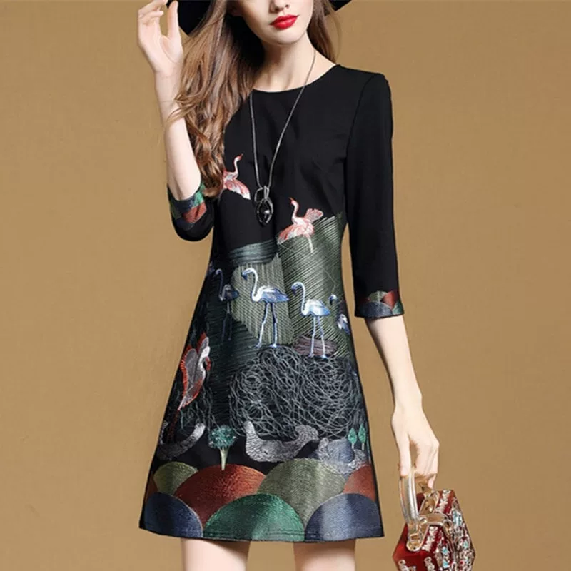 Đầu mùa xuân mới của phụ nữ quần áo phụ nữ phổ biến tính khí của phụ nữ ba phần tư tay áo váy thêu cao cấp Váy ôm chữ A - A-Line Váy