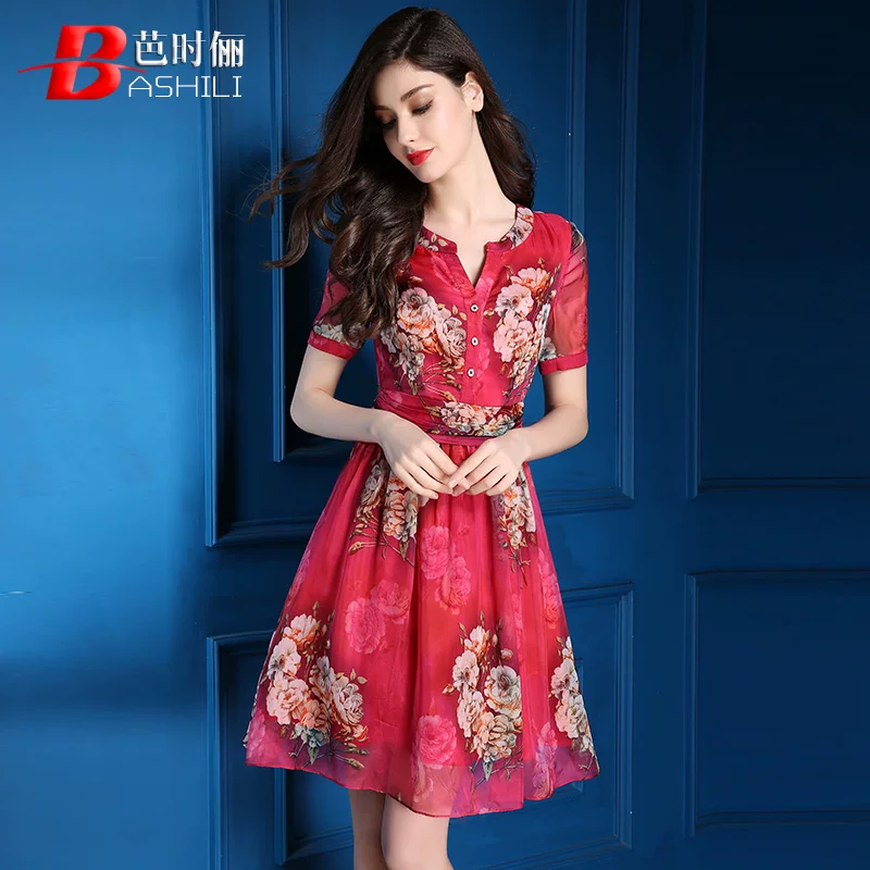 Basili mùa hè 2020 phong cách mới của phụ nữ Âu Mỹ Váy chữ A giữa eo ngắn tay váy in tính khí - A-Line Váy