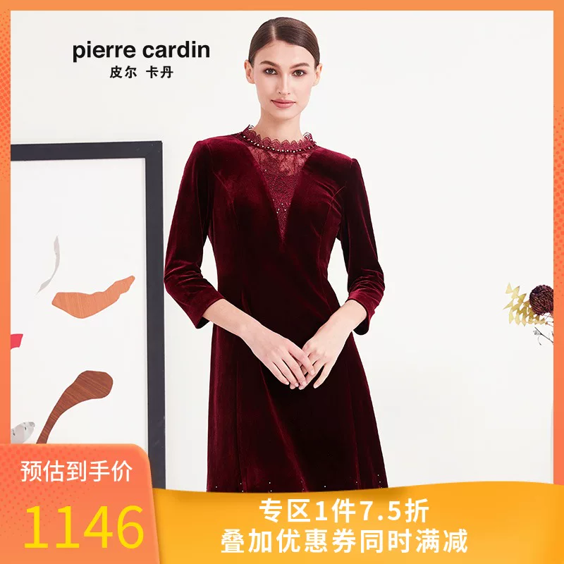 Quầy quần áo phụ nữ Pierre Cardin chính hãng 19 năm rượu vang đỏ dài tay váy nhỏ cổ đứng Váy chữ A P93DL25R2 - A-Line Váy