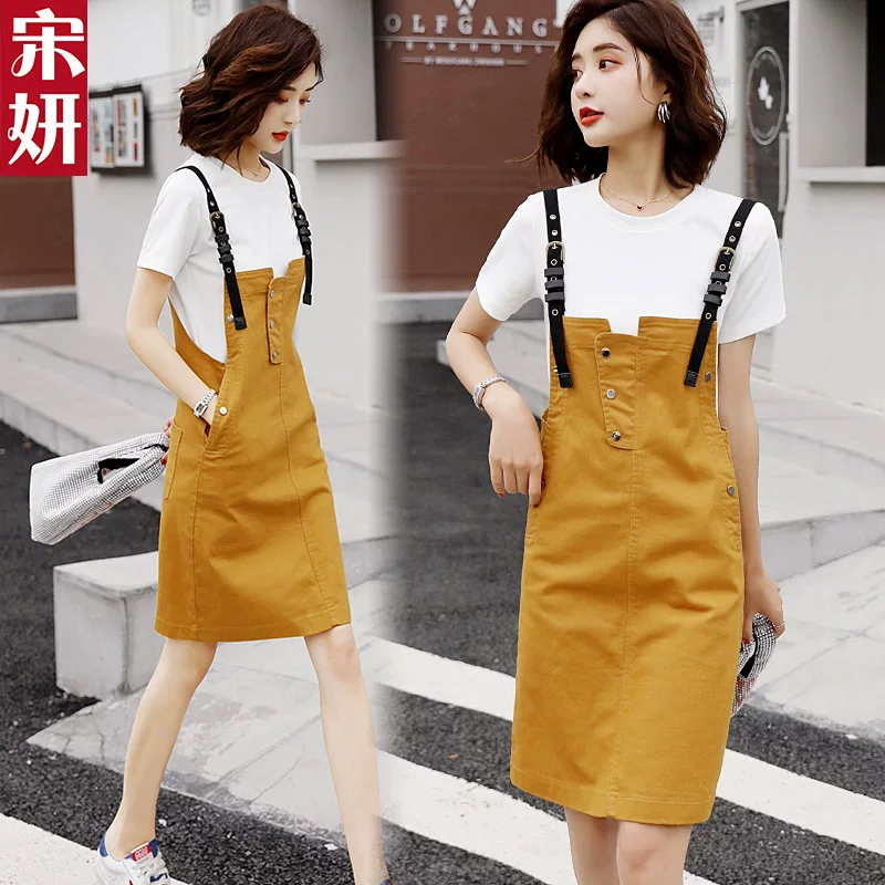 2020 xuân hè mới váy midi denim dài vừa phải nữ sinh viên eo thon a-line áo thun đình chỉ váy hai dây - A-Line Váy
