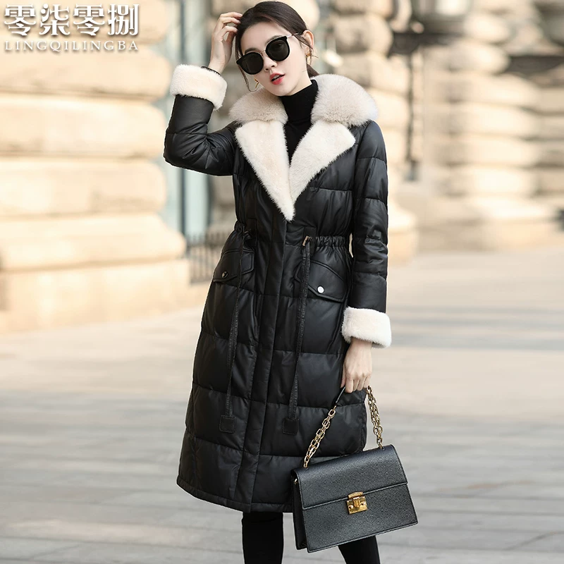 2020 mới da cừu xuống áo khoác nữ dài eo eo cáo cộng với lông chồn cổ áo da - Quần áo da