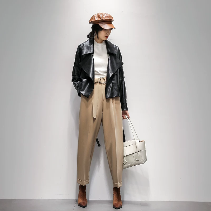 2020 áo khoác da xe máy ngắn cổ chữ V màu đen mới với thắt lưng áo khoác da mỏng cho nữ mùa thu - Quần áo da