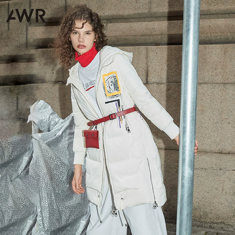 Amii tối giản cá tính tương phản màu dây kéo xuống áo khoác nữ mùa đông buông lơi trên đầu gối dài trùm đầu lạnh xuống áo khoác - Xuống áo khoác
