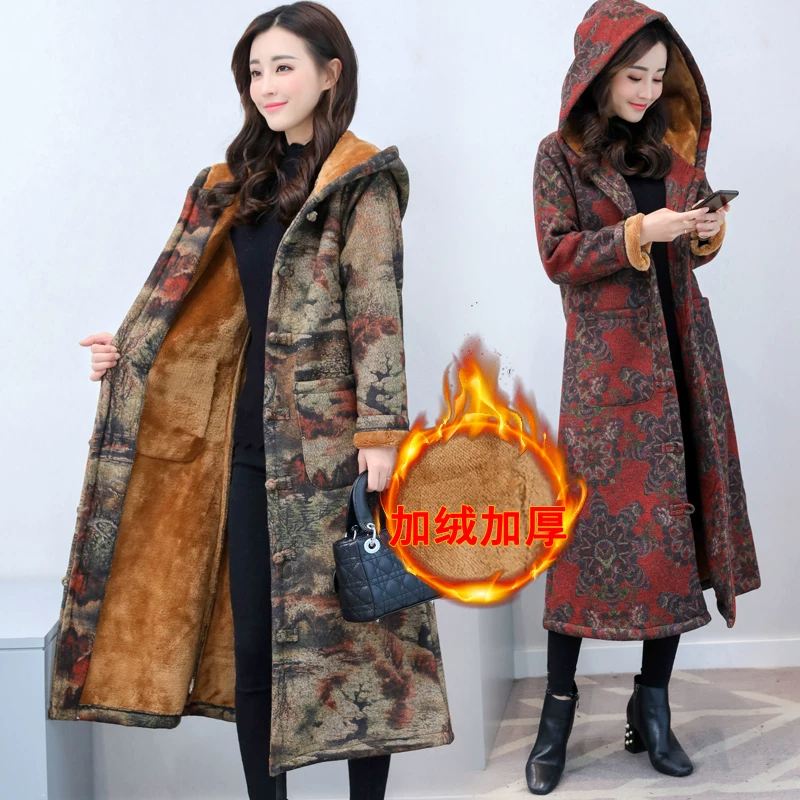 Miễn phí vận chuyển 2020 mùa thu và mùa đông phong cách dân tộc áo khoác độn bông giữa nữ cộng với nhung dày kiểu đĩa Trung Quốc áo khoác trùm đầu retro - Bông