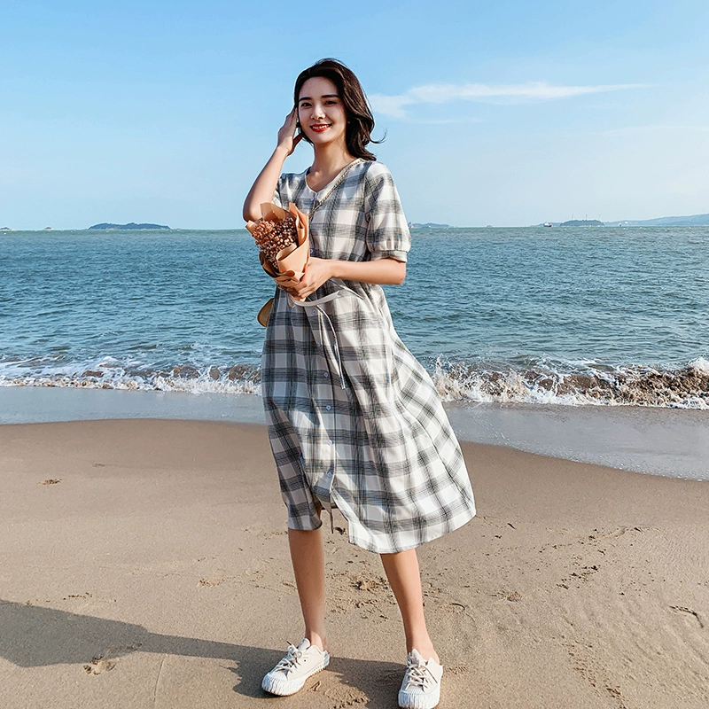 Quần áo nữ mùa hè mới của ETJ20, phong cách cung điện, platycodon grandiflorum, mối tình đầu, váy maxi kẻ sọc vuông Pháp - Váy dài