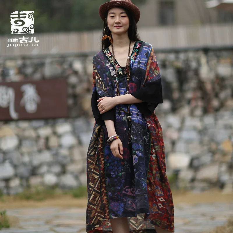 Jiqiu Guer phong cách quốc gia phụ nữ váy dài mùa hè in retro khâu váy lỏng lẻo giữa chiều dài - Váy dài