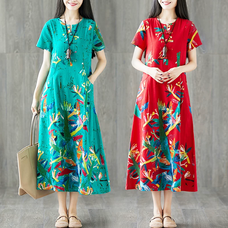 Mùa hè 2020 phụ nữ gió quốc gia cotton và vải lanh kích thước lớn in vòng cổ đầm eo lỏng lẻo đầm ngắn tay - Váy dài