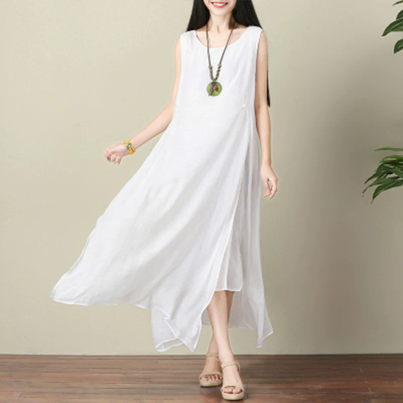Mùa hè của phụ nữ cộng với kích thước lụa và vải lanh hai lớp vải cotton và vải lanh váy văn học áo vest không tay váy vải lanh trắng đáy váy dài - Váy dài