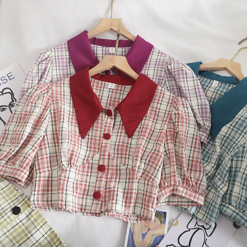 4757 Pháp thích hợp Hàn Quốc mùa hè 2020 tay áo bong bóng áo sơ mi kẻ sọc ngắn áo khoác nữ - Áo sơ mi