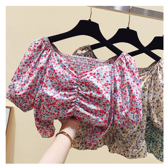 Ngọt ngào và thanh lịch xù cổ chữ V nhỏ áo voan hoa tay áo kèn tay áo thun nữ 3013 màu hàng đầu - Áo sơ mi