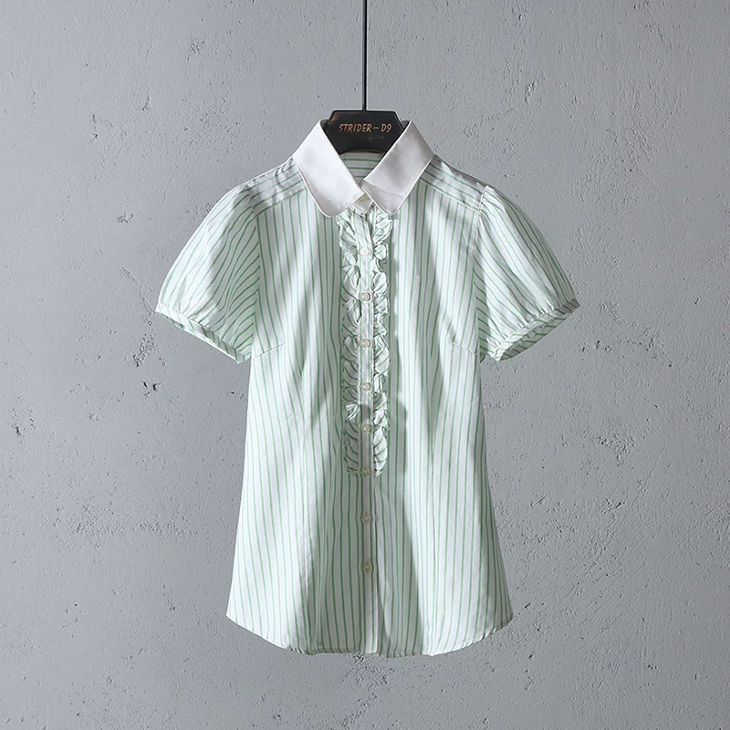 Chất lượng ưa thích của Yiwang của phụ nữ áo sơ mi ngắn tay ngắn tay sọc ren placket mỏng áo trên - Áo sơ mi