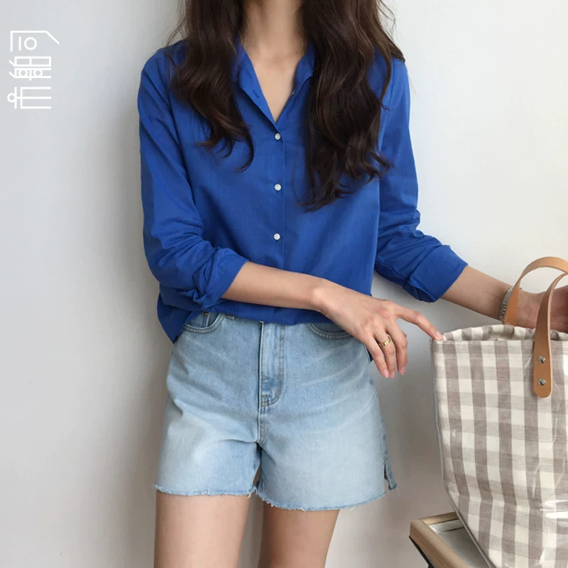 Phụ nữ Hàn Quốc Shibosi Mùa xuân và mùa thu Phong cách mới Một bên ngực Màu tinh khiết Màu xanh đơn giản Màu xanh da trời rời Áo sơ mi nữ - Áo sơ mi