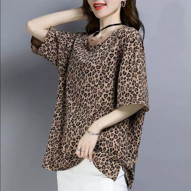 2021 áo thun ngắn tay rộng rãi mới của phụ nữ mới kích thước lớn giảm béo áo sơ mi dưới cùng của phụ nữ cộng với chất béo có chiều dài trung bình in họa tiết da báo phụ nữ - Áo phông