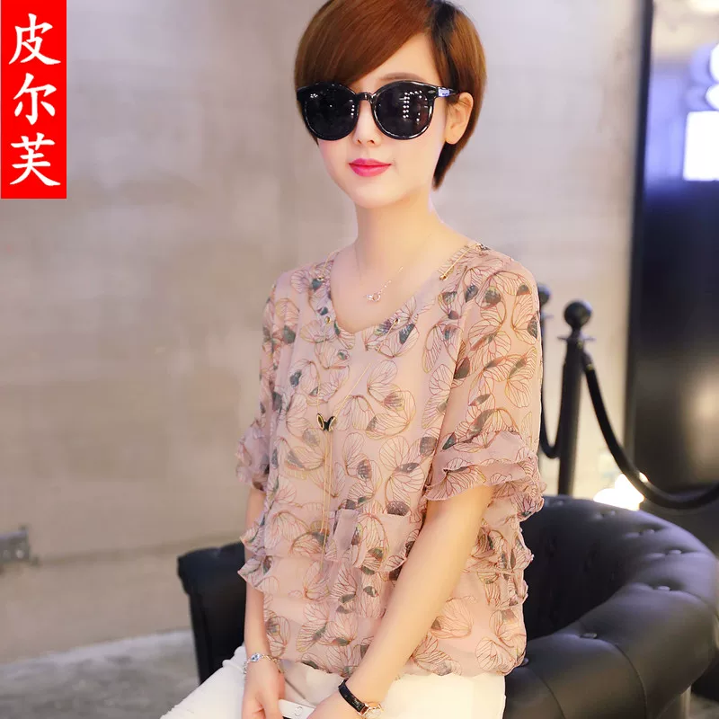 Mùa hè 2021 phụ nữ cổ chữ V Ngắn tay áo phông in hình hàng đầu Áo sơ mi voan thời trang phù hợp nhất che bụng cộng với xu hướng kích thước - Áo phông