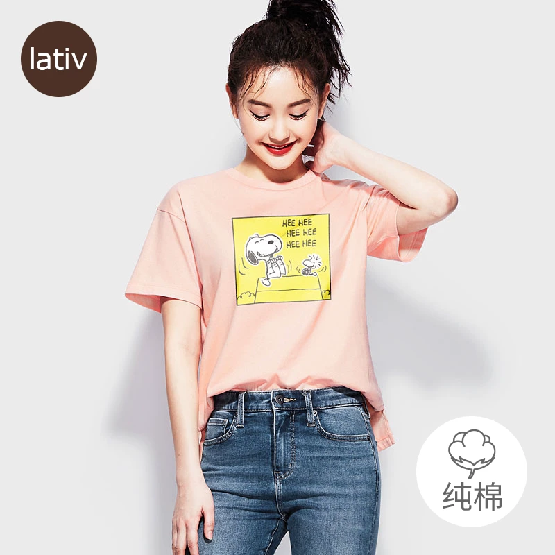 [清] lativ Chengyi Snoopy Cotton tinh khiết IP chính hãng Áo thun ngắn tay lửng Nữ hàng đầu Phụ nữ mùa hè - Áo phông