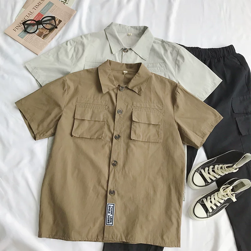Mùa hè gió trung tính đôi BF lỏng màu rắn tay ngắn thương hiệu thủy triều dụng cụ Mỹ retro Ami kaki áo hoang dã - Áo sơ mi dài tay