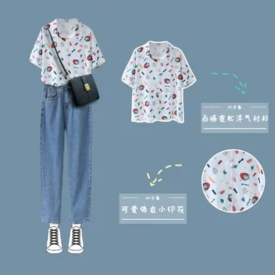 Mùa hè 2020 phiên bản Hàn Quốc mới của phong cách Harajuku in hình con bướm ngắn tay áo sơ mi nữ rộng rãi - Áo sơ mi dài tay