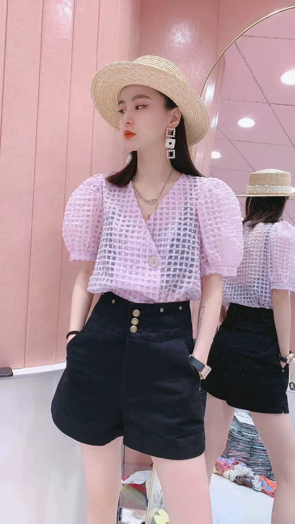 Áo sơ mi cổ chữ V màu đen nữ 2020 mới hè giản dị áo sơ mi tay ngắn màu đỏ lưới mỏng manh - Áo sơ mi dài tay