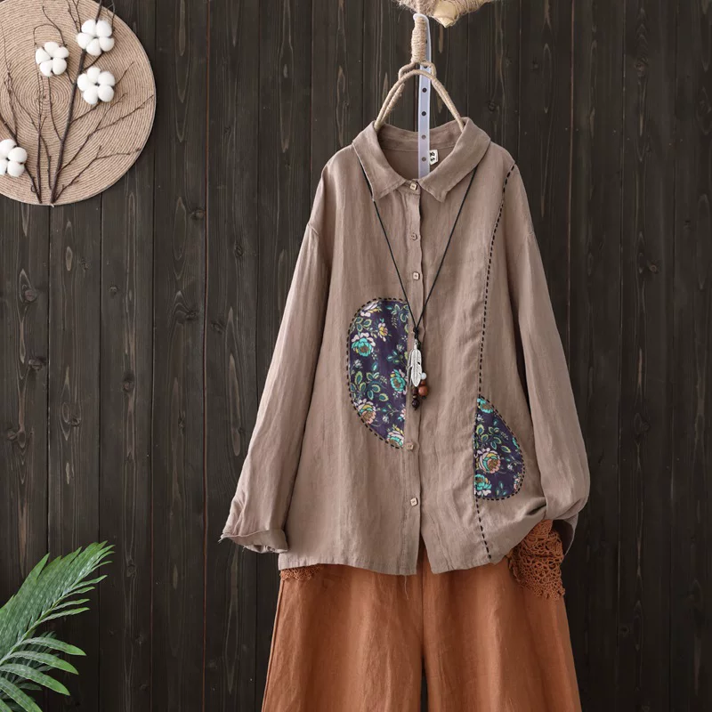 Mùa xuân và mùa thu Bông và vải lanh Áo sơ mi in mở cỡ lớn Áo sơ mi nữ văn học Áo sơ mi vải lanh lỏng lẻo Áo sơ mi nữ ve áo dài tay áo - Áo sơ mi dài tay